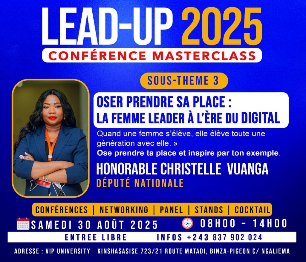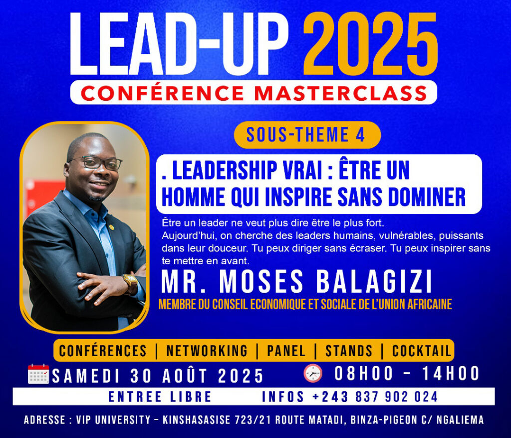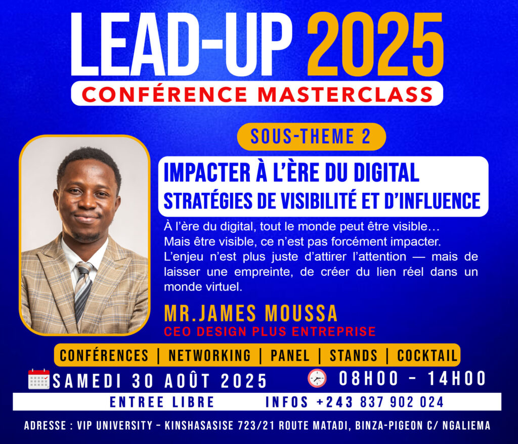 Le samedi 30 août 2025, la ville de Kinshasa a accueilli l’un des événements les plus inspirants de l’année : la conférence masterclass LEAD UP 2025, organisée avec brio par Design Plus Communication, sous l’impulsion de son directeur et initiateur, James Moussa.